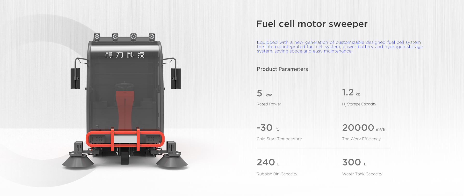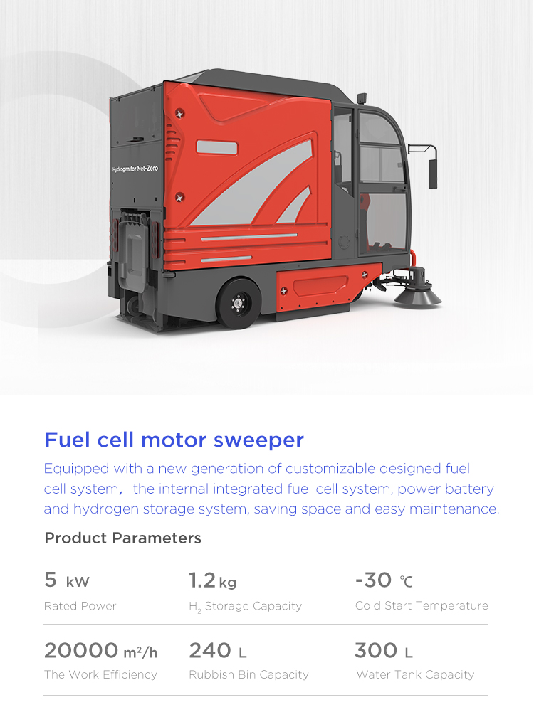 The new generation fuel cell system of sweeper can be customized developed and designed. It integrates the fuel cell system, power battery and hydrogen storage system, saving space and easy maintenance. Refilling hydrogen in 3 minutes, working for 6 hours, low noise and zero emission.