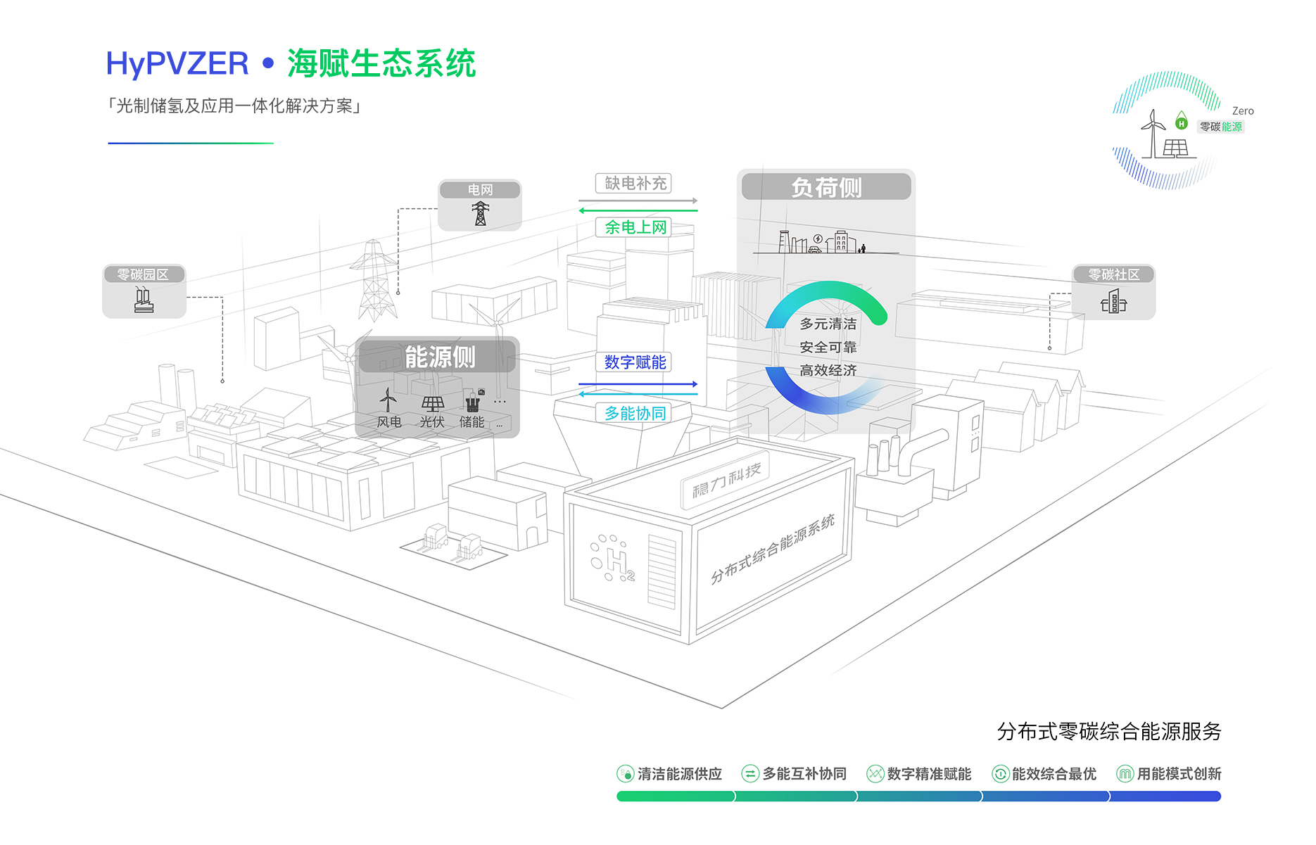 當氫和電結合在一起,形成一個強大的耦合能源協同網絡,讓我們的能源供應更清潔、更順暢、更經濟,讓我們能夠從可再生能源稟賦的地區獲取更多綠色能源。同時,通過氫能支撐的智能直流微網——更靈活也更強韌,滿足用戶的“電、熱、冷、氣、水”多種用能需求。